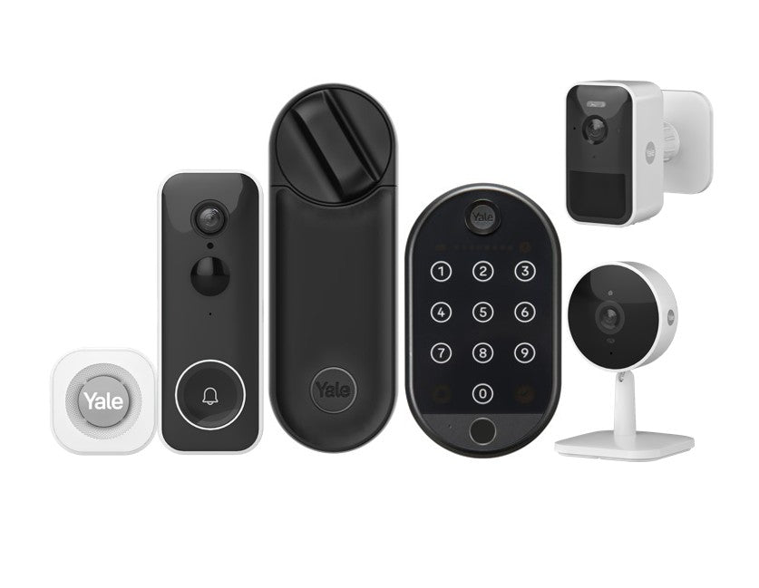חבילת אבטחה חכמה חכמה פלוס לבית הכוללת מנעול חכם Linus™ L2 + פעמון חכם + יחידת רמקול פנימי + מצלמת אבטחה ביתית חכמה + מצלמת אבטחה חיצונית | Yale®